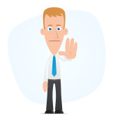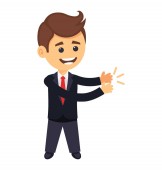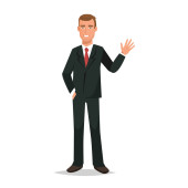 Biznesmen. Biznesmen stoi i jedna ręka jest podniesiona, druga opuszczona. Ciemny garnitur, koszula i krawat. Ilustracja w płaskim stylu. Izolacja na białym tle