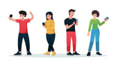 Ludzie z telefonem. Kreskówkowa młodzież z telefonem. Mężczyzna i kobieta korzystający ze smartfona. Nowoczesny styl życia. Połączenie telefoniczne. Ilustracja odizolowana na białym tle w płaskim stylu