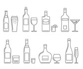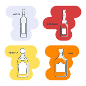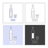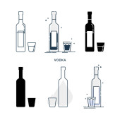 Zestaw butelek i kieliszków z wódką w różnych stylach. Wzorcowy napój alkoholowy do restauracji, baru, pubu. Impreza symboli. Kolekcja jeden drink. Izolowana płaska ilustracja na białym tle.