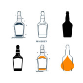 Zestaw butelek i kieliszków z whisky w różnych stylach. Wzorcowy napój alkoholowy do restauracji, baru, pubu. Impreza symboli. Kolekcja jeden drink. Izolowana płaska ilustracja na białym tle.