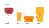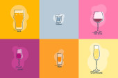 Alkohol szklany. Napij się. Zestaw ikon napojów. Projekt linii. Wódka, wino, szampan, whisky, alkohol, piwo, tequila, rum, martini. Projekt linii ilustracja izolowane na białym tle w stylu płaskim