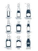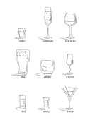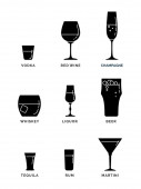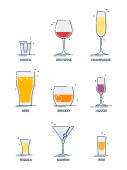 Napij się szklanki. Koncepcja alkoholu. Zestaw ikon napojów. Projekt linii. Wódka, wino, szampan, whisky, alkohol, piwo, tequila, rum, martini. Ilustracja kreskówki izolowane na białym tle w płaskim stylu.
