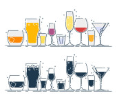 Piwo szklane szampan Martini likier czerwone wino linia sztuki w stylu płaskim. Restauracja alkoholowa ilustracja do projektowania uroczystości. Element konturu. Ikona konturu napoju. Izolacja na białym tle w stylu graficznym