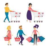 Mężczyzna i kobieta z torbami na zakupy. Młodzi ludzie stoją z torbami na zakupy. Ilustracja izolowana na białym tle w płaskim stylu