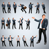 Zestaw biznesmen z telefonu w stylu kreskówki na tle. Udany młody człowiek w garniturze w różnych pozach z telefonem. Pracownik trzyma smartfona w ręku. Mądra osoba. Styl płaski.