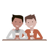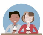 Zdjęcie "Szczęśliwi ludzie piją kawę i jedzą ciasteczka. Młody mężczyzna i kobieta stojący i trzymający filiżanki kawy i ciasto. Para je śniadanie. Ilustracja kreskówki izolowane na białym tle w płaskim stylu" może być wykorzystywane do celów osobistych i komercyjnych zgodnie z warunkami zakupionej licencji Royalty-free. Obraz jest dostępny do pobrania w jakości wysokiej rozdzielczości do 5760x3840.