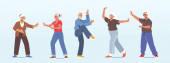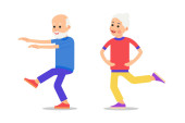 Zestaw aktywnych starszych ludzi. Starzy mężczyźni i kobiety w różnych pozycjach sportowych. Szczęśliwa aktywna, starsza para. Zdrowy styl życia dla starszych. Ilustracja postaci odizolowanych na białym tle w płaskim stylu