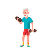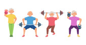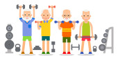 Starsi mężczyźni wykonują ćwiczenia do podnoszenia sztangi. Dorośli ludzie w różnych pozach z podnoszeniem ciężaru. Ćwiczenia fizyczne, trening, trening, sport, zdrowy tryb życia. Ilustracja płaski styl.