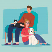 Para ze zwierzętami. Szczęśliwy zwierzak w ramionach mężczyzny i kobiety. Piękna rodzina z kotem i psem. Atrakcyjny styl życia. Wypoczynek ze zwierzętami. Ilustracja odizolowana na tle w płaskim stylu