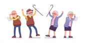 Starzy ludzie stoją z podniesionymi rękami. Starszy mężczyzna i starsza kobieta krzyczą i gestykulują. Ilustracja postaci odizolowanych na białym tle w płaskim stylu
