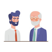 Zdjęcie "Dwóch starszych mężczyzn stoi w pobliżu. Jeden emeryt w pozdrowieniu podniósł rękę, drugi starszy w akimbo pozie. Ilustracja postaci odizolowanych na białym tle w płaskim stylu" może być wykorzystywane do celów osobistych i komercyjnych zgodnie z warunkami zakupionej licencji Royalty-free. Obraz jest dostępny do pobrania w jakości wysokiej rozdzielczości do 5760x3840.
