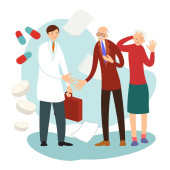 Lekarze i pielęgniarka przy łóżku chorego starca. Pielęgniarka jest gotowa do wykonania zastrzyku. Badanie lekarskie. Opieka zdrowotna, usługi medyczne w szpitalu. Medyczna ilustracja w płaskim stylu.