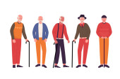 Staruszku. Starszy człowiek w różnych pozach. Mężczyzna w garniturze, koszuli i krawacie. Zestaw ilustracji kreskówki izolowane na białym tle w płaskim stylu