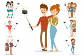 Samo kobiece zdjęcie odizolowane. Przyjaciele robią wspólne zdjęcia autoportretowe. Szczęśliwe, uśmiechnięte młode dziewczyny robiące sobie selfie. Ilustracja w płaskim stylu. Izolacja