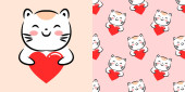 Narysuj szczęśliwego kota. Drukuj bezszwowy wzór i kartka z życzeniami dla dzieci tkanin