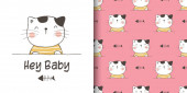 Narysuj szczęśliwego kota. Drukuj bezszwowy wzór i kartka z życzeniami dla dzieci tkanin