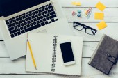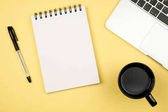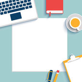 miejsce pracy z notatnikiem, smartfonem, długopisem, kawą, słuchawkami i laptopem. miejsce pracy odizolowane na niebieskim tle. Zeszyt widok z góry. Wolny strzelec. Ilustracja wektora. Kreatywna praca