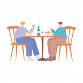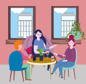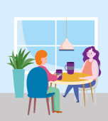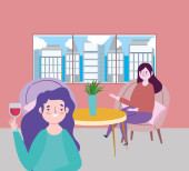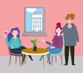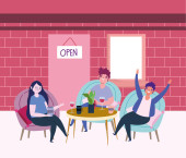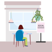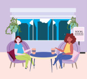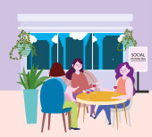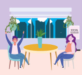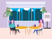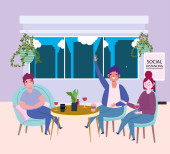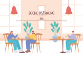 społeczna zdystansowana restauracja lub kawiarnia, mężczyźni i kobiety siedzący przy stole zachować odległość, covid 19 koronawirus, nowe normalne życie