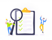 Zadanie wykonane koncepcja biznesowa malutka osoba z megafonem, szkło powiększające w pobliżu gigantyczny schowek pełna lista kontrolna.