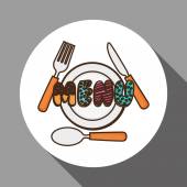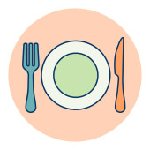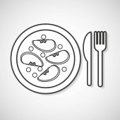 Widok z góry na śródziemnomorskie danie z widelcem i nożem. Talerz z ryżem, krewetkami, sałatą, pieprzem i sztućcami. Wektorowa ilustracja naczynia