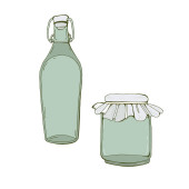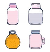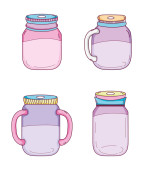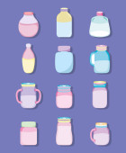 Zestaw obrazów przyborów do mleka. Puszka, dzbanek, szkło i butelka.