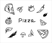 Włoska pizza i składniki najwyższej ramki widok. Włoski wzór menu żywności. Rysowany ręcznie szkic, ilustracja wektora. Ilustracja grawerowanego stylu. Etykieta na pizzę do menu.