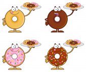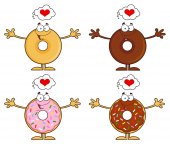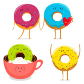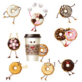 Zestaw różnych kreskówkowych pączków. Pączek pije koktajl, je lody i pływa. Ilustracja wektora izolowana na białym tle.