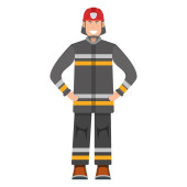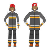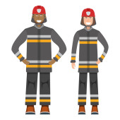Postać strażaka stojącego na białej, płaskiej ilustracji wektora. Człowiek mężczyzna i kobieta ważna działalność zawodowa strażaka, uśmiechnięci ludzie zawód, zajęcie społeczne.