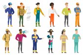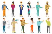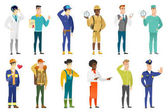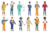 Lekarz, policjant, pracownik, strażak stojący na białej, płaskiej ilustracji wektorowej. Ważna działalność zawodowa mężczyzn, uśmiechnięty zawód, zawód społeczny.