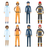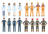 Zdjęcie "Lekarz, policjant, pracownik, strażak stojący na białej, płaskiej ilustracji wektorowej. Ważna działalność zawodowa mężczyzn, uśmiechnięty zawód, zawód społeczny." może być wykorzystywane do celów osobistych i komercyjnych zgodnie z warunkami zakupionej licencji Royalty-free. Obraz jest dostępny do pobrania w jakości wysokiej rozdzielczości do 5760x3840.