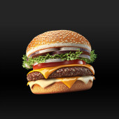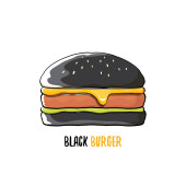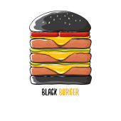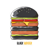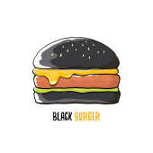 Czarny wektor burger na szarym tle, burger z czarną bułką, kotlet, ser, pomidor i sałata. realistyczny styl wektor ilustracji