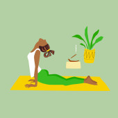 Zdjęcie "Dziewczyna ćwiczy jogę w domu podczas kwarantanny. Młoda brunetka w dresie robi pozę świecy asanowej. Ćwiczenia sportowe podczas samoizolacji. Ilustracja płaska wektora." może być wykorzystywane do celów osobistych i komercyjnych zgodnie z warunkami zakupionej licencji Royalty-free. Obraz jest dostępny do pobrania w jakości wysokiej rozdzielczości do 5760x3840.