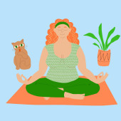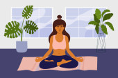 Zdjęcie "Dziewczyna w dresie ćwiczy jogę na macie w domu podczas kwarantanny. Ładna, młoda kobieta z ciemnymi włosami robi asanę. Sport podczas samoizolacji. Ilustracja płaska wektor zapasów izolowane." może być wykorzystywane do celów osobistych i komercyjnych zgodnie z warunkami zakupionej licencji Royalty-free. Obraz jest dostępny do pobrania w jakości wysokiej rozdzielczości do 5760x3840.