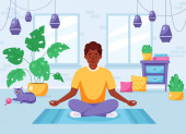 Dziewczyna w dresie ćwiczy jogę na macie w domu podczas kwarantanny. Ładna, młoda kobieta z ciemnymi włosami robi asanę. Sport podczas samoizolacji. Ilustracja płaska wektor zapasów izolowane.