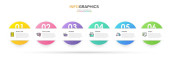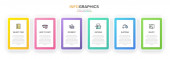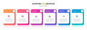 Koncepcja procesu zakupów z 6 kolejnymi krokami. Sześć kolorowych elementów graficznych. Projekt harmonogramu dla broszury, prezentacji, strony internetowej. Układ projektu infograficznego.