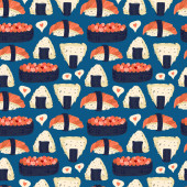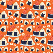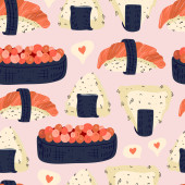 Wzór sushi bez szwu. Japońskie jedzenie. Ilustracja wektora. Zabawny kolorowy plakat typograficzny, projekt nadruku odzieży. skandynawskie wzornictwo nordyckie do barów lub wnętrz lub okładek, tekstyliów lub tła.