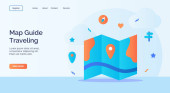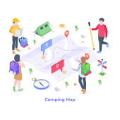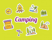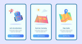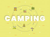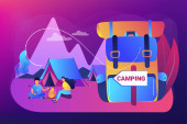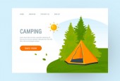Namiot na okrągło w pobliżu plecak tło drzewa słoneczna mapa pogody broszura outdoor camping koncepcja z płaskim stylu wektor projektu
