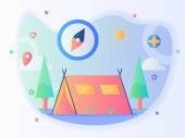 Zdjęcie "Namiot na okrągło w pobliżu plecak tło drzewa słoneczna mapa pogody broszura outdoor camping koncepcja z płaskim stylu wektor projektu" może być wykorzystywane do celów osobistych i komercyjnych zgodnie z warunkami zakupionej licencji Royalty-free. Obraz jest dostępny do pobrania w jakości wysokiej rozdzielczości do 5760x3840.