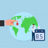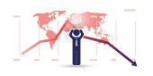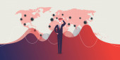 Globalny upadek gospodarczy z powodu pandemii wirusa korony - fale infekcji, problemy finansowe, kryzys gospodarczy - koncepcja projektowania z mapą świata, wykresy i biznesmen trzymający głowę
