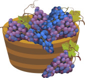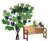 Gałąź winorośli z zielonymi liśćmi, niebieską gromadą i koszykiem winogron izolowanych na białym tle