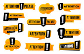Proszę o uwagę. Odznaka z ikoną megafonu. Płaska ilustracja wektor na białym tle.