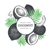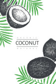 Kokos z liści palmowych szablon projektu. Ręcznie rysowane wektorowe ilustracje żywności. Egzotyczna roślina w stylu grawerowanym. Retro botaniczne tło tropikalne.