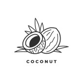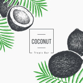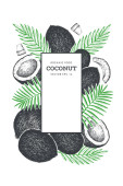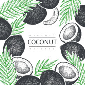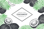 Kokos z liści palmowych szablon projektu. Ręcznie rysowane wektorowe ilustracje żywności. Egzotyczna roślina w stylu grawerowanym. Retro botaniczne tło tropikalne.