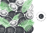 Kokos z liści palmowych szablon projektu. Ręcznie rysowane wektorowe ilustracje żywności. Egzotyczna roślina w stylu grawerowanym. Retro botaniczne tło tropikalne.