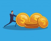 Biznesmen wspinaczka pieniądze drabina płaska koncepcja wektor ilustracji. Udany człowiek chodzący na złote monety postać z kreskówki 2D do projektowania stron internetowych. Tworzenie kreatywnego pomysłu na zysk i oszczędności