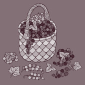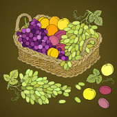 Winogrona i brzoskwinie w koszyku. Ilustracja kreskówki
