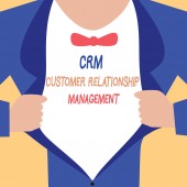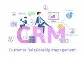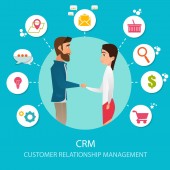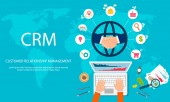 CRM (Customer relationship management) słowo wektor płaska infografika ilustracja z ikonami dla biznesu, promocji, usługi, sprzedaży i komunikacji.Wiadomości bańki dla każdej części strategii marketingowej