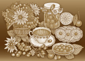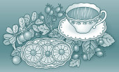 Herbata, jagody, owoce ręcznie rysowane ilustracja