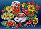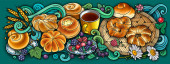 Słodycze, jagody, owoce, napoje ilustracja