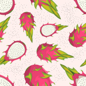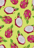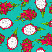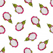 Płynny wzór z owoców smoka pitaya czerwony, żółty, różowy kolor, na tle. Ręcznie rysowane wektor ilustracji w stylu szkicu do letniej tropikalnej okładki, vintage tekstury. Całe owoce i plasterki.